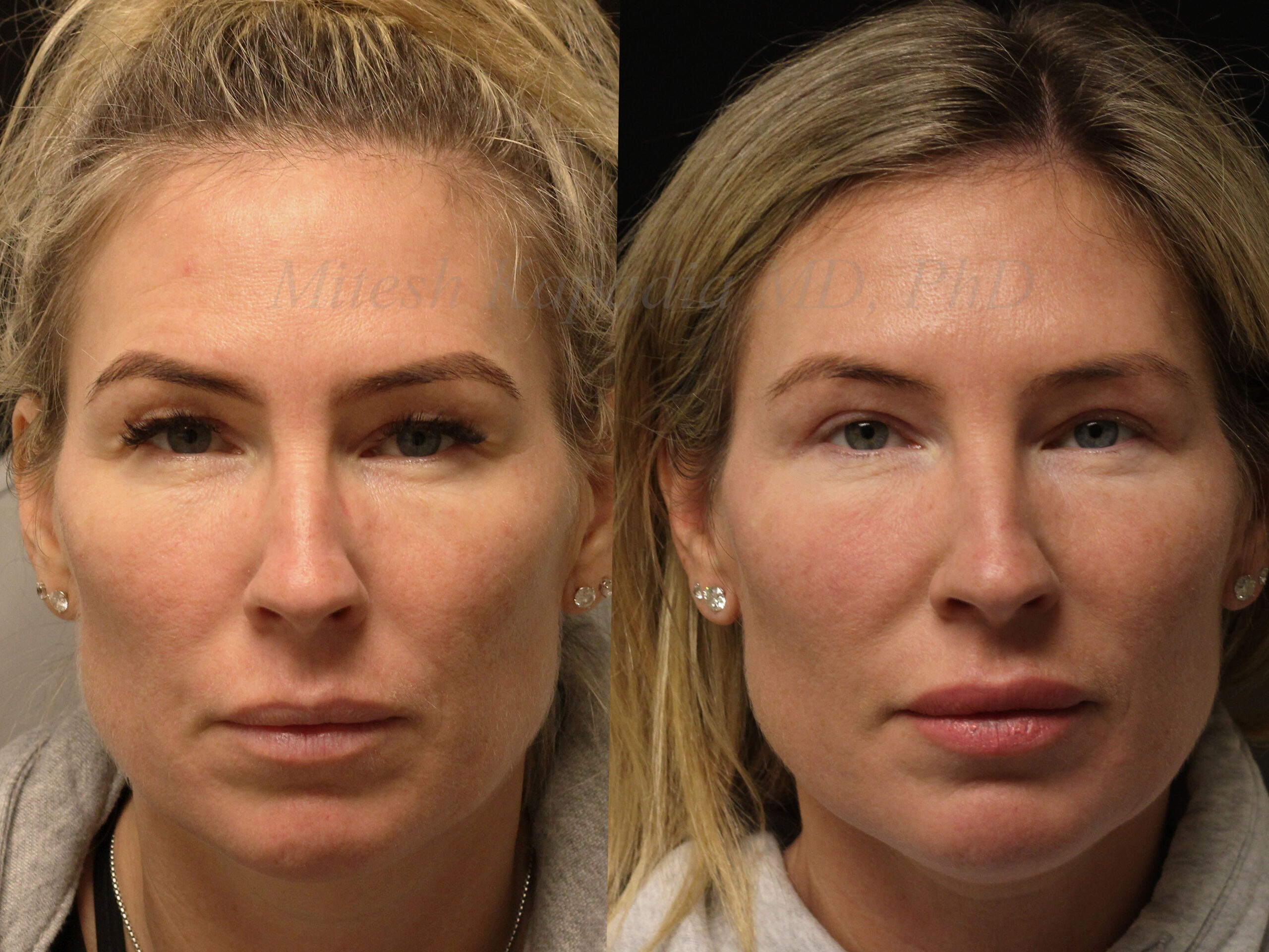 These photos show a woman in her late 50s before and three months after bilateral upper blepharoplasty with right ptosis repair. Botox was used to treat her overarching brows and relax them to a more normal position.⠀ ⠀ After surgery, she looks younger and more awake but still looks like herself. ⠀ ⠀ Ptosis repair was performed on the right side to elevate the height of that eyelid and excess skin was removed from both sides. ⠀ ⠀ This patient also had a tendency to pull her forehead up causing an overly arched lateral brow. Patients with droopy eyelids often do this to help keep their eyes open. After years and years of pulling the forehead up this becomes a habit, which can persist even after corrective surgery. ⠀
