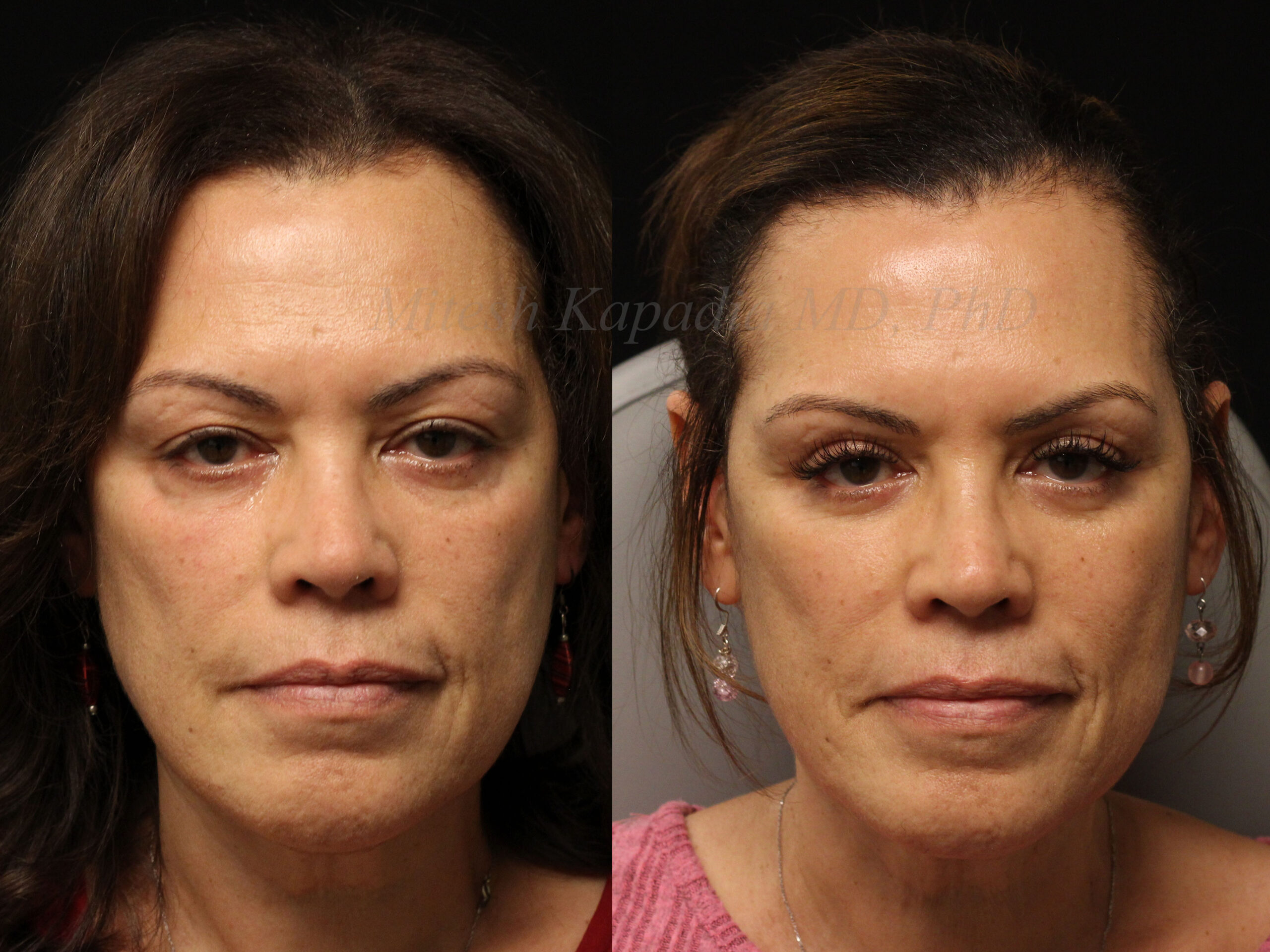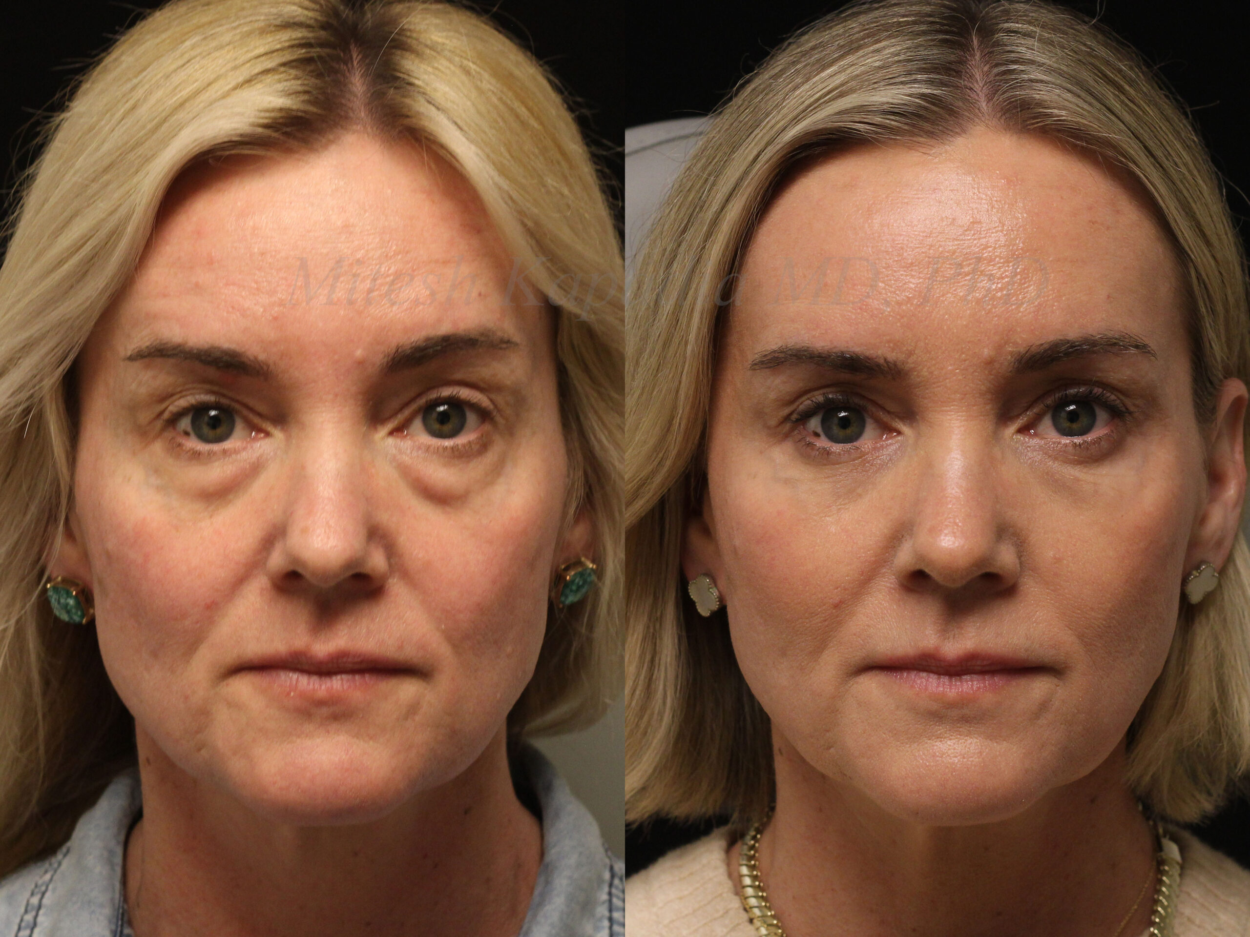 These photos show a woman in her 20s before and after one vial of lower eyelid fillers. Before the procedure, there is hollowing under her eyes which leads to dark circles and a tired look. After the procedure, there is a smoother transition from the lower eyelid to the cheek, giving her a more refreshed look.