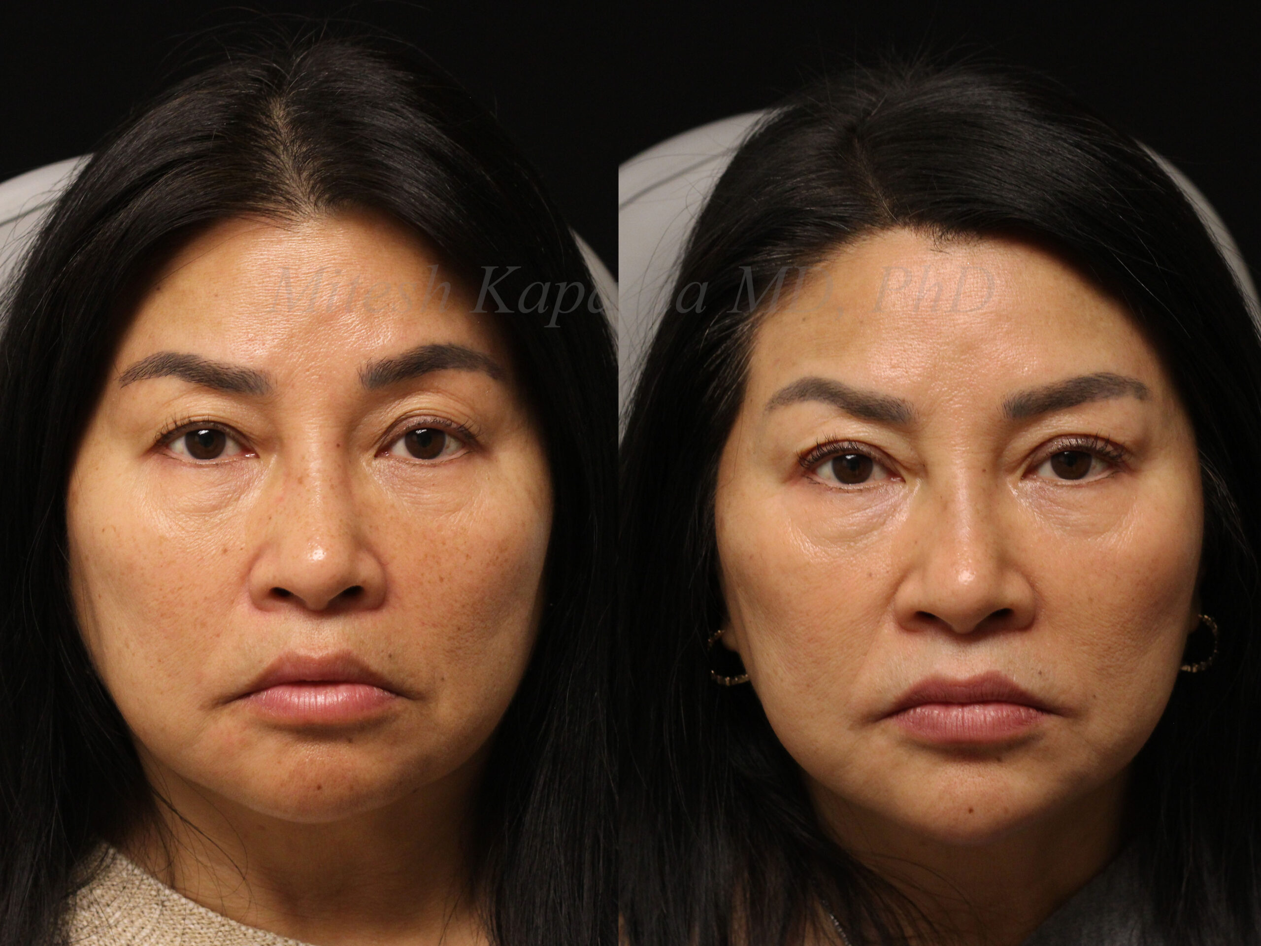 These photos show a woman in her late 40s before and two months after upper and lower blepharoplasty surgery. No fillers were used in this case. This case is a great example of how eyelid surgery alone can make a dramatic improvement in the overall appearance of a patient’s face. Prior to surgery, this patient had excess upper eyelid skin as well as under eye bags, which gave her a tired, aged appearance. After surgery, she looks more youthful and less tired without looking fake or overcorrected.