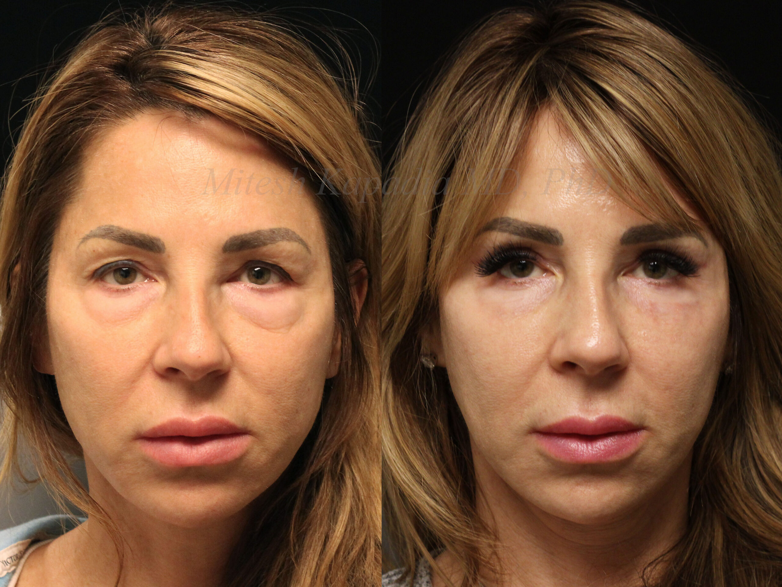 These photos show a woman in her late 50s before and after upper and lower blepharoplasty surgery. Before surgery, she has hooding of her upper eyelids and under eye bags. After surgery, she looks younger and more refreshed, without looking overdone or unnatural. . Patient quote: “This was one of my best decisions. I used to hide behind glasses, but I don’t anymore. People tell me I look so healthy now and I feel great.” .